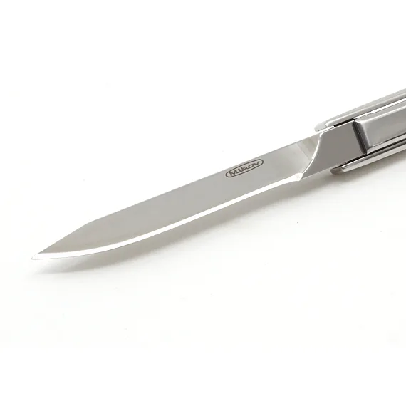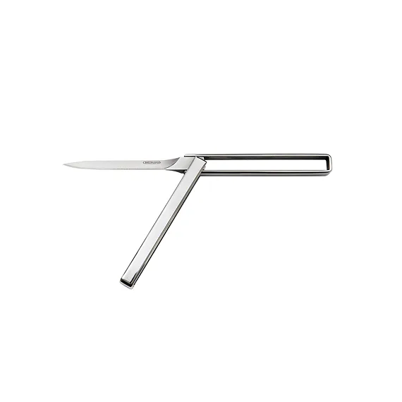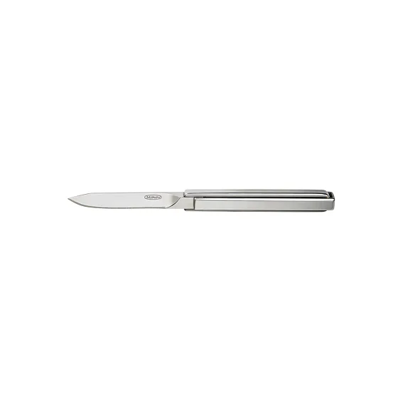 Auf den ersten Blick sieht die einzigartige Lösung der Messerkonstruktion wie eine interessante Denkaufgabe aus. Doppeltes Umklappen der Edelstahlgriffe um 180° bringt das Messer in den Bereitzustand. Auf die entgegengesetzte Weise wird die mittelspitzige Klinge versteckt. Alle Griffkanten sind für bessere Ergonomie und bequemes Halten des Messers abgeschrägt.