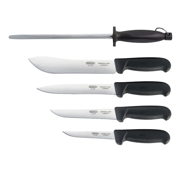 Sadu řeznických nožů doplňuje ocílka. S použitím této ocílky budou nože stále velmi ostré.