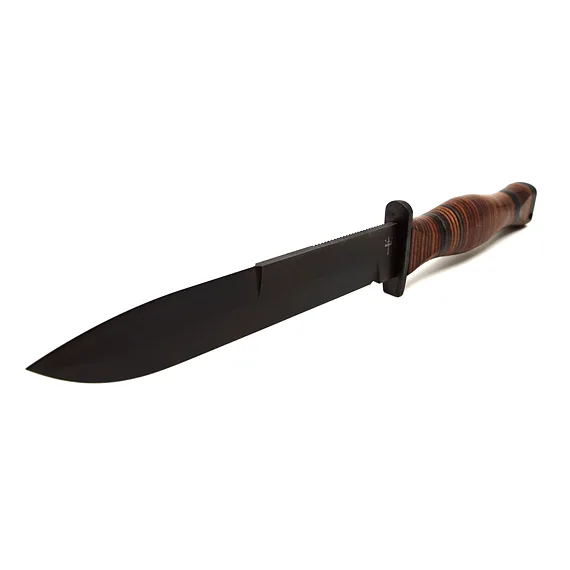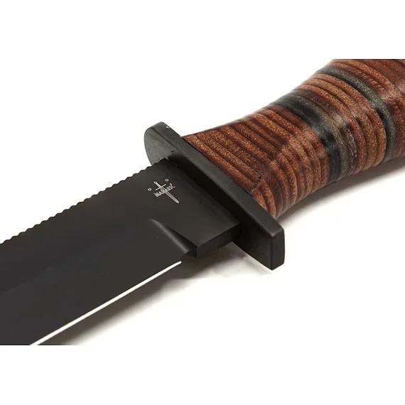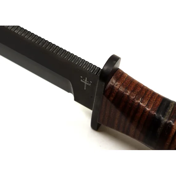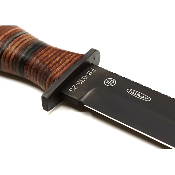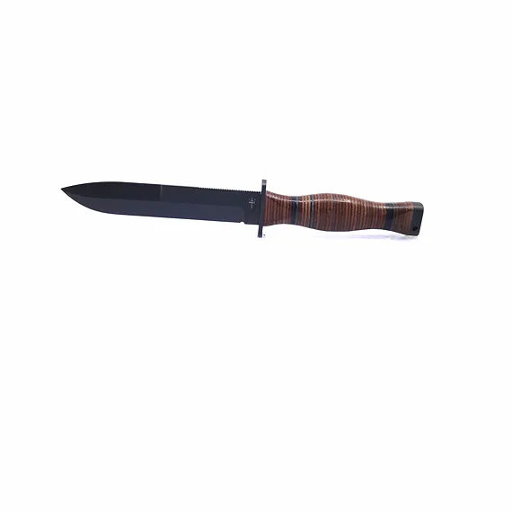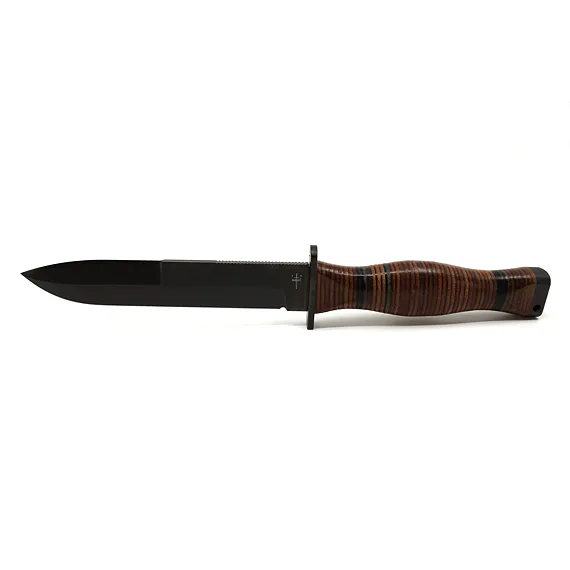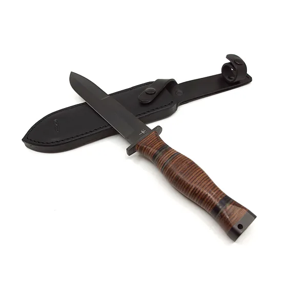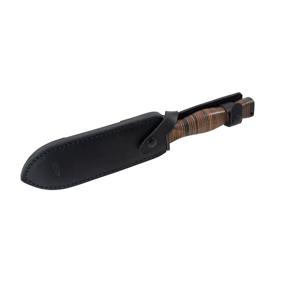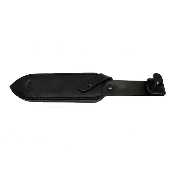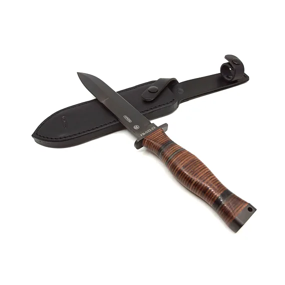 Rukojeť z oválných kroužků. Hlavice s otvorem pro závěsnou šňůru. Nůž FALCO je dodáván s černou koženou pochvou.