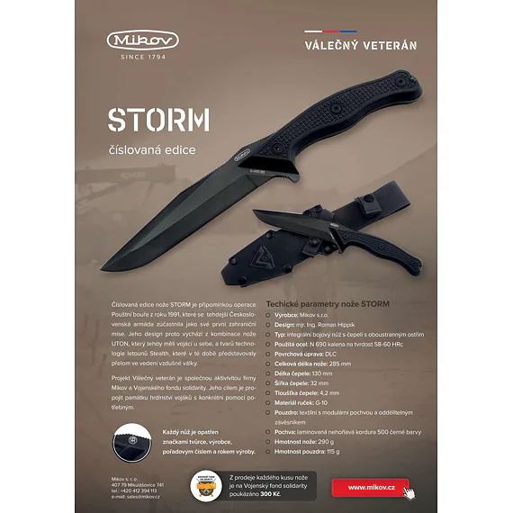 Projekt válečný veterán je společnou aktivivitou firmy Mikov a Vojenského fondu solidarity. Jeho cílem je propojit památku hrdinství vojáků s konkrétní pomocí potřebným. Z každého prodanáho nože STORM bude poukázáno 300 Kč Vojenskému fondu solidarity