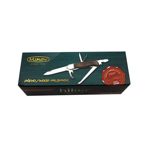 Čepel kapesního zavíracího nože HIKER je vyrobena z kvalitní nerezové oceli 420 o tvrdosti 53-55HRc. Tento kapesní zavírací nůž HIKER je vybaven kvalitní pilkou s dvěma řadami zubů, kováním a střenkou vyrobenou z kvalitního exotického dřeva Palisandr. Kapesní zavírací nůž HIKER je také vybaven kroužkem pro uchycení a je dodáván v koženém pouzdře s logem Mikov.