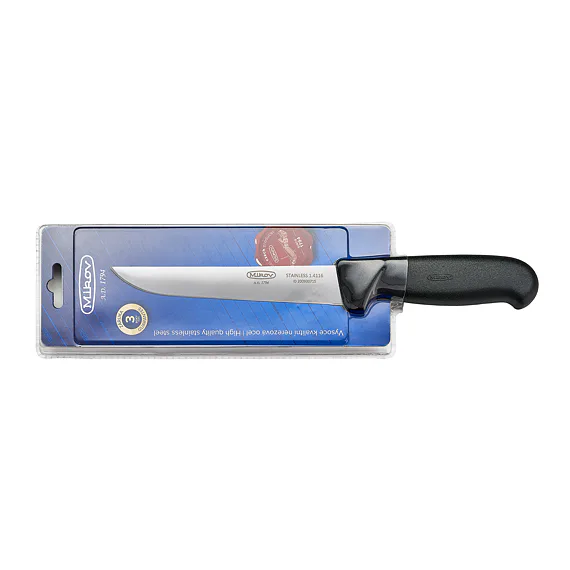 Kvalitní čepel s logem Mikov je vyrobena z kvalitní nerezové oceli 1.4116 (440A) o tvrdosti 55 – 58 HRc s vysokou řezivostí a otěruvzdorností osvědčenou pro výrobu řeznických a kuchyňských nožů. Je zasazena do plastové rukojeti, jejíž ergonomie umožňuje bezpečný a pohodlný úchop všemi prsty.