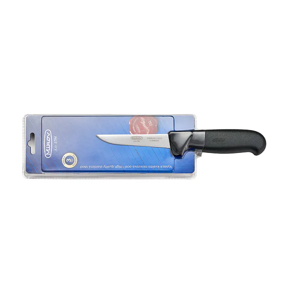 Kvalitní čepel s logem Mikov je vyrobena z kvalitní nerezové oceli 1.4116 (440A) o tvrdosti 55 – 58 HRc s vysokou řezivostí a otěruvzdorností osvědčenou pro výrobu řeznických a kuchyňských nožů. Je zasazena do plastové rukojeti, jejíž ergonomie umožňuje bezpečný a pohodlný úchop všemi prsty.