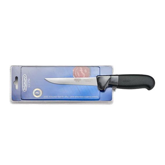 Kvalitní čepel s logem Mikov je vyrobena z kvalitní nerezové oceli 1.4116 (440A) o tvrdosti 55 – 58 HRc s vysokou řezivostí a otěruvzdorností osvědčenou pro výrobu řeznických a kuchyňských nožů. Je zasazena do plastové rukojeti, jejíž ergonomie umožňuje bezpečný a pohodlný úchop všemi prsty.