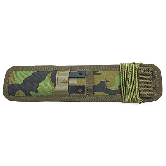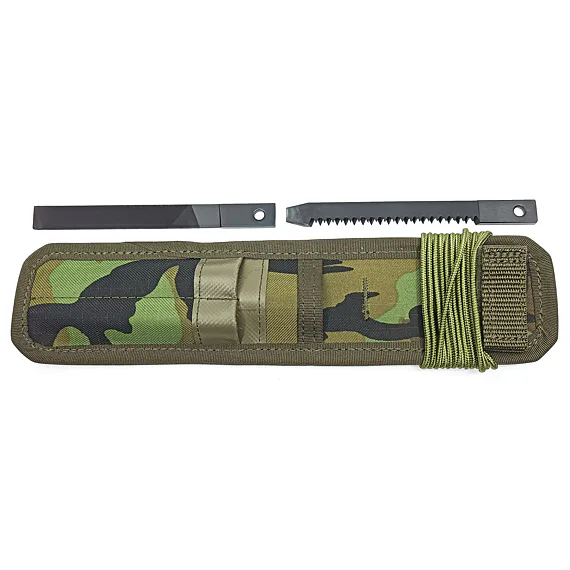 Pouzdro je vybaveno pilkou, pilníkem a šňůrou paracord zelené barvy