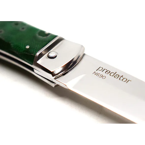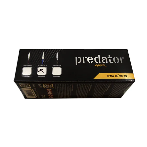 Střenka nože je vyrobena z materiálu zvaného RAFFIR. Jedná se o nový materiál, který je odolný a příjemný do ruky. Její ergonomický tvar ve spojení s ostatními díly dává vyniknout nádhernému a propracovanému tvaru nože s doplňujícím názvem PREDATOR RAFFIR.